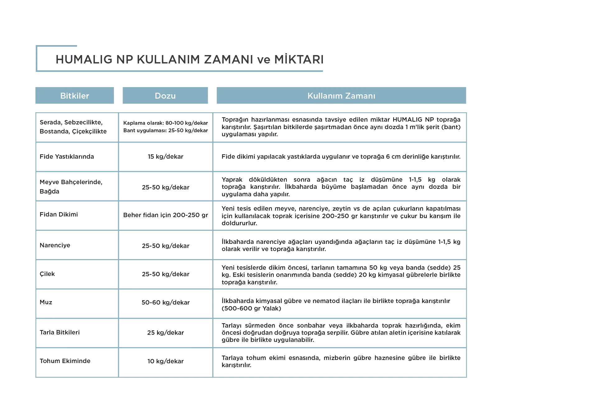 Humalig NP, toprağa uygulanan granül formda doğal humik asit içeren bir toprak ıslahı ürünüdür. Kök gelişimini destekleyerek daha sağlam bir kök sistemi oluşumuna yardımcı olur ve bitkinin genel dayanımını artırmayı hedefler.