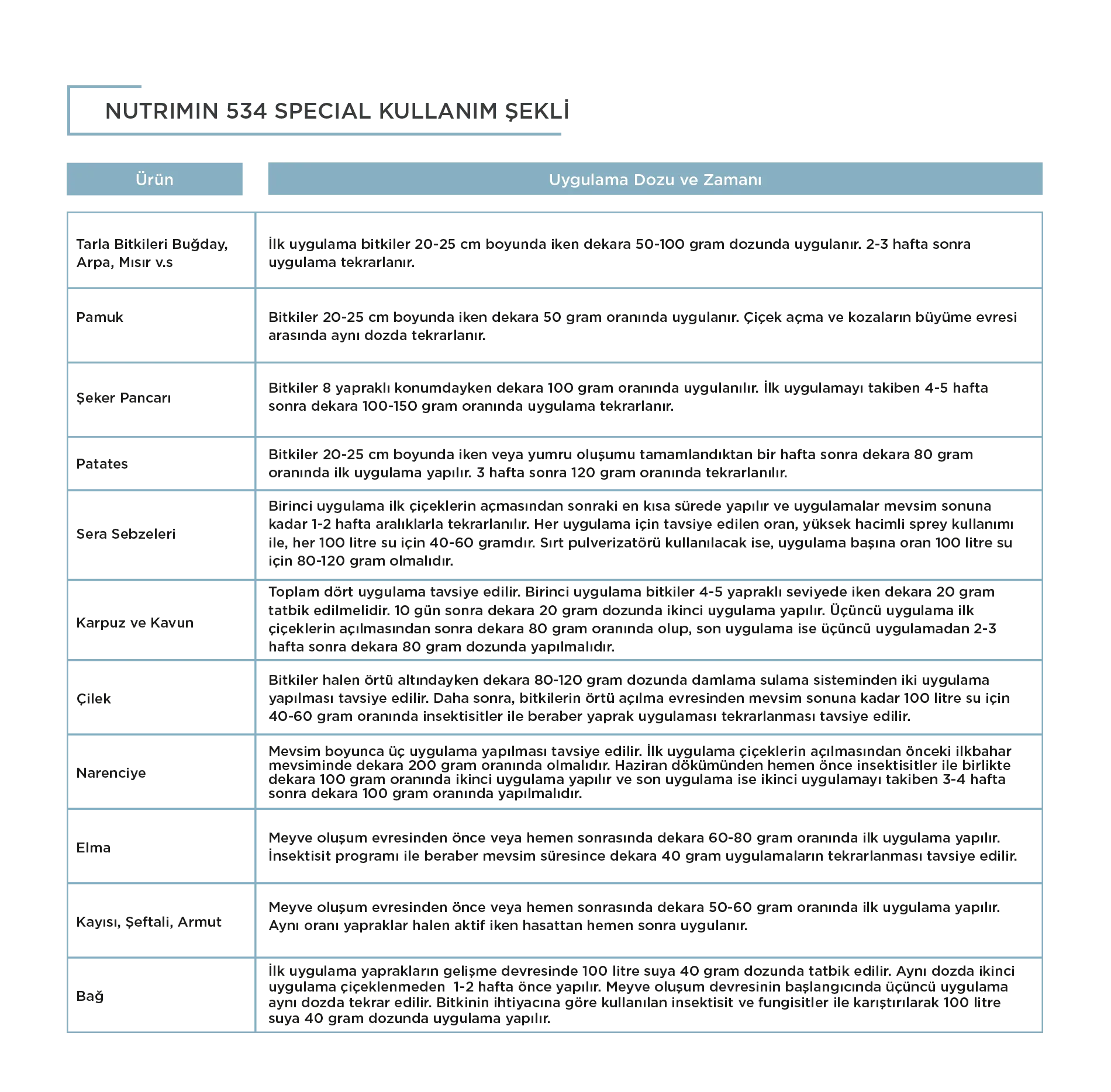 Ürün hem yapraktan hem topraktan uygulanabilir; ayrıca damlama sulama sistemiyle verilmeye uygundur. Tarla ve endüstri bitkilerinden sebze ve meyvelere, narenciyeden bağ ve süs bitkilerine kadar geniş bir kullanım alanına sahiptir. Doğru sonuç için yaprak ve toprak analizlerine göre, uygun dönemde ve önerilen dozlarda uygulanması tavsiye edilir.